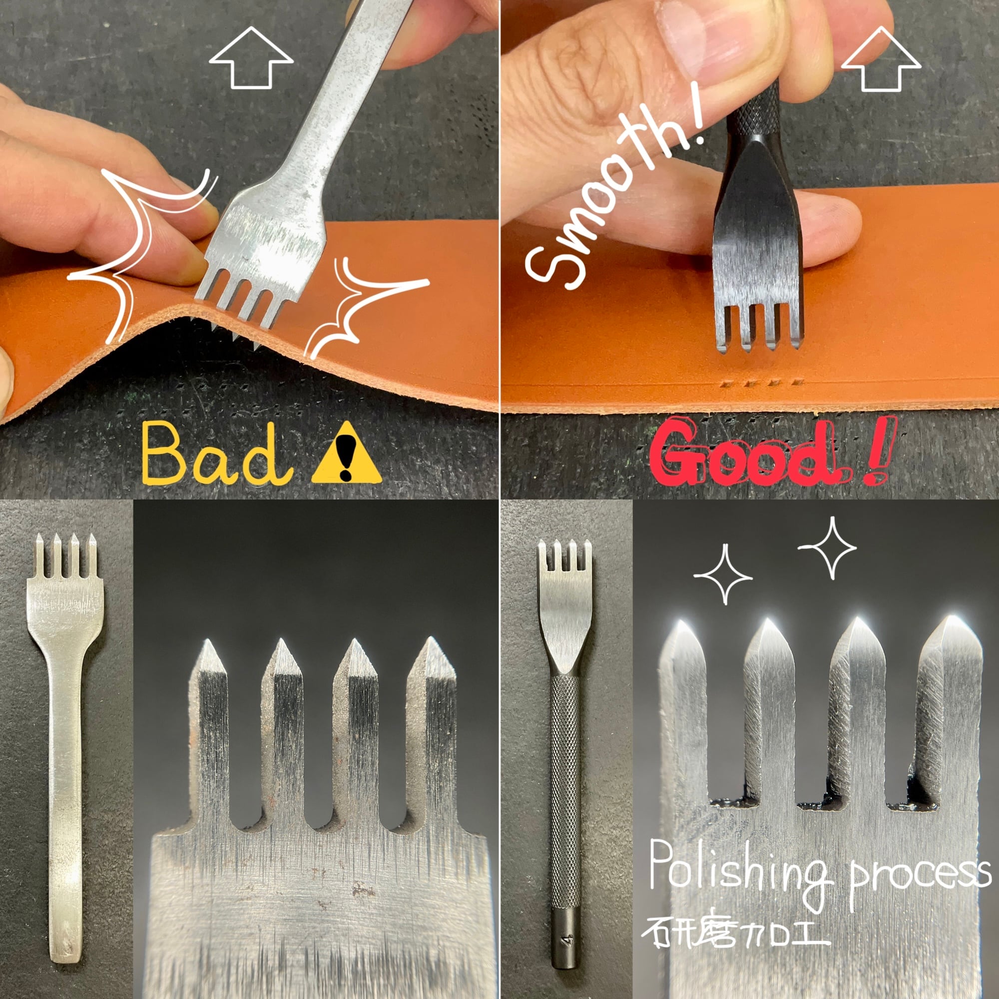刃の角度と研磨による効果から、革から抵抗無く菱目打が抜ける為、素材のダメージがありません。